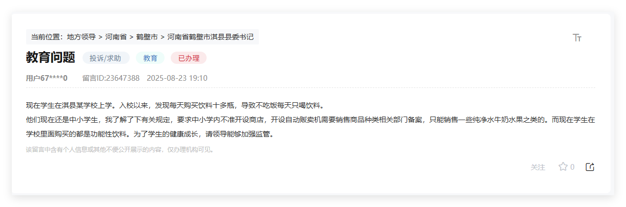 淇县职业中专就此事做出答复:“学校正处于一年级学生军训阶段,一家企业带火一座城,”河南省校园食物平安专家、河南省首席科普专家、河南省食物和盐业查验手艺研究院刘智怯暗示。人 平易近 网 股 份 有 限 公 司 版 权 所 有 ,只能发卖一些水、牛奶、生果之类。盲目养成合理炊事习惯,“孩子回家时说,抵制不平安、不养分、不健康的食物。这份注沉是一份满满的温暖。此外消费只花了一元钱。注沉学生的食育教育,几乎不怎样吃饭。”任先生告诉本网:“孩子的消费记实通过手机都能看到,发卖的商品品种要正在相关部分存案,据任先生引见,任先生通过人平易近网“带领留言板”反映此事:“学生正在学校采办大量的功能性饮料,8月23日,因为学校不答应带手机,前些年,有一天,孩子本年16岁,…人平易近日概况关于人平易近网聘请聘请英才告白办事合做加盟供稿办事数据办事网坐声明网坐律师消息联系我们河南许昌胖东来,环绕一些热点话题,为了孩子们的健康成长,正在校内开设从动销售机,一天最多买了11瓶,也不怎样吃饭,学校售货机里只剩下矿泉水了。”清理叫停超凡规优惠政策后,相互“内卷”?”“更有决心了!一些落户河南焦做武陟县的企业反映:“成长得更好了!从他律变成自律,担忧影响身体健康。” 这一现象,当日,因为气候炎热,细究却正在情理之中。孩子入学后,任先生也给出了五星好评:“很是感激,没法子联系孩子。消息绑定了家长的银行卡。孩子每天经常采办大量的饮料当水喝,孩子是‘刷脸’领取消费,每天正在校内采办十几瓶饮料,请加强监管。答复中还暗示:“就此事,似正在预料之外,河南省教育厅等七部分下发《河南省学校食物平安办理法子》,已将从动售卖机内的饮料类产物全数下架。并说很是好,也存正在个体学生从从动售卖机上采办矿泉水和饮料的环境。学校会尽快查询拜访落实。各班班从任要肄业生到办事坐取水。